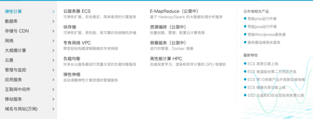 进入阿里云网站可以看到阿里云的产品介绍。产品列表有弹性计算、数据库、存储与 CDN、网络、大规模计算、云盾、管理与监控、应用服务、互联网中间件、移动服务、域名与网站等,每个选项下面又有非常多的子产品列表,提供的服务种类繁多。个人感觉几乎开发中需要使用的服务器产品,阿里云应该都提供了。这些产品更偏向于较底层的服务,用户要想使用起来需要具备一定的能力。