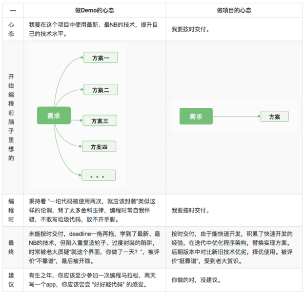 同时敢不敢写垃圾代码,完全取决于心态。写程序其实有两种心态,一种是做 Demo 的心态,一种是做项目的心态。让我们来对比下这两个心态: