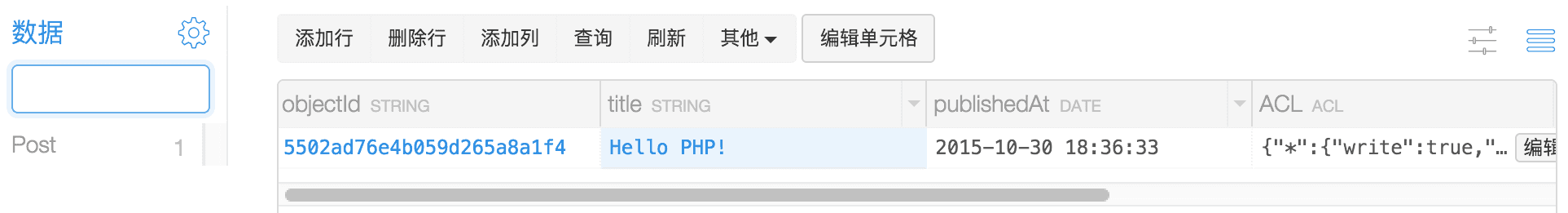 $post->save();进入 LeanCloud 控制台,可以看到刚保存的数据: